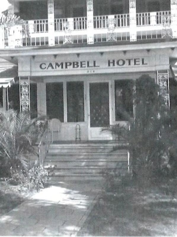 groups and walked daily to the bay for a swim. They had two adult daughters Mary born in 1879 and Ruth born in 1896 who both eventually followed their parents to St. Petersburg. The southwest corner of the growing city was yet undeveloped but within city limits. Campbell soon bought this land. It was bounded by 7th Ave. S., 16th St. S, 12th St. S and Campbell Ave. S (later Dunmore Ave. S.). Campbell set about to develop the northern part of his land and opened a small office at 1401 5th Ave. S. for his real estate transactions. The southern part remained undeveloped and utilized by the Black residents as an informal gathering place. Around the same time the Campbell’s bought land at 219 2nd Ave. N. and built the Campbell Hotel, a busy seasonal hotel. See photo D. Campbell divided his time between his real estate business and the flourishing hotel. Eventually daughter Ruth and her husband took it over. The hotel survived a long time and was demolished after 2000. The Cottonwood Apartments now stand on this site.